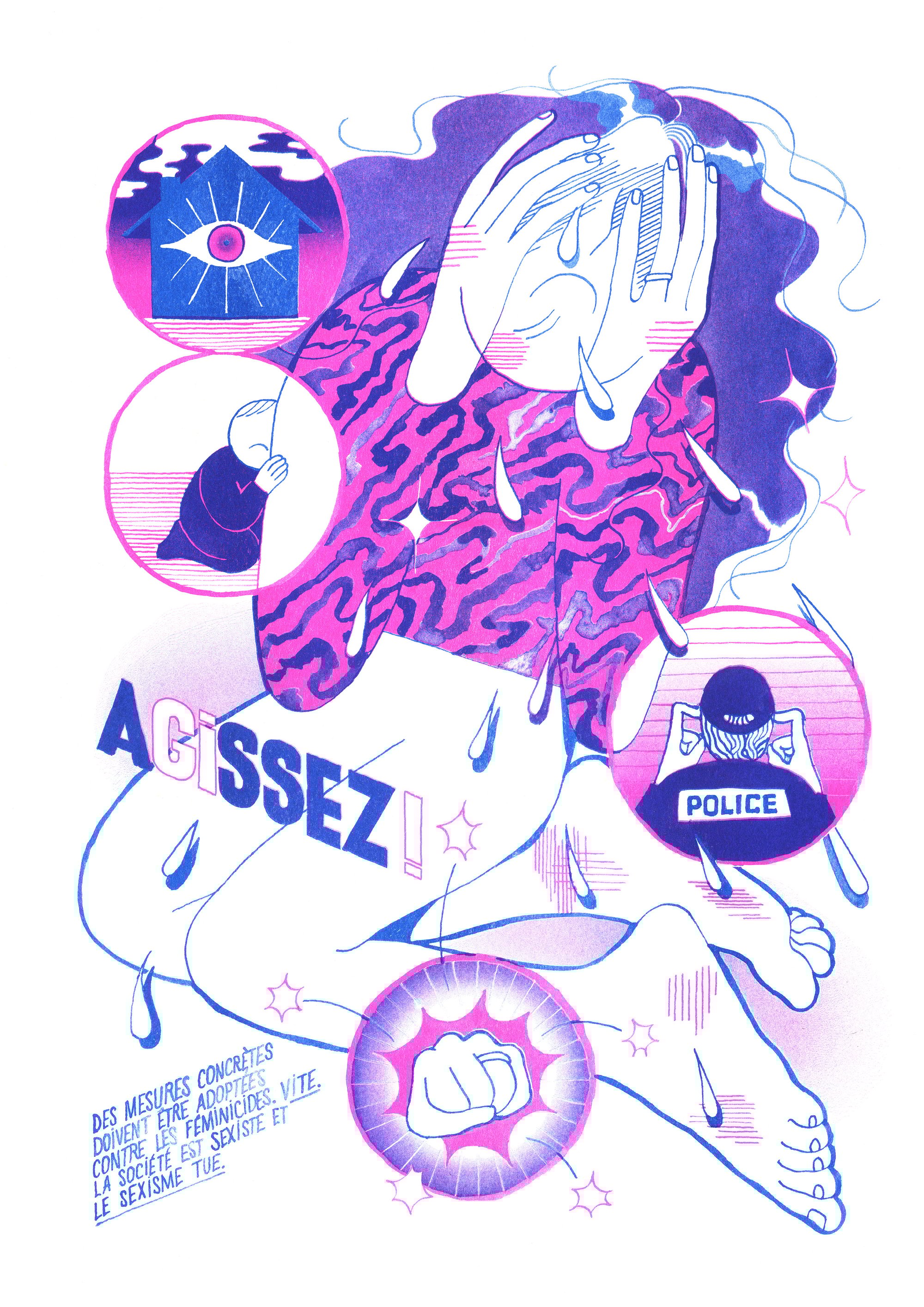 Drawing designed for a collective exhibition organised by the artist Durgamaya in Angoulême, France. Along this exhibition was set a talk about violence against women and femicides.